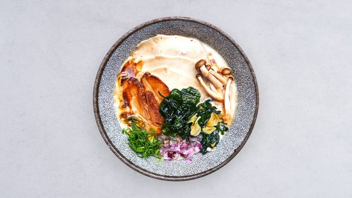Kremowy bulion wieprzowy z dodatkiem oleju z palonego czosnku, schab sous vide, boczek w marynacie sojowej, chips ze szpinaku, smażony na maśle szpinak z czosnkiem, grzyby shimeji, dymka, czerwona cebula