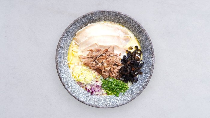 Kremowy bulion wieprzowy z dodatkiem pasty truflowej i oliwy truflowej, schab sous vide, cienkie plastry karkówki parzonej w cebulowym shoyu, grzyby mun, por, czerwona cebula, dymka