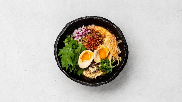 Kremowy bulion wieprzowo - drobiowy z dodatkiem pasty sezamowej i oleju chilli. Mięso soboro, konfitowane mięso wołowe, jajko, kiełki fasoli mung, mizuna, cebula czerwona, dymka, sezam, orzeszki gochugar